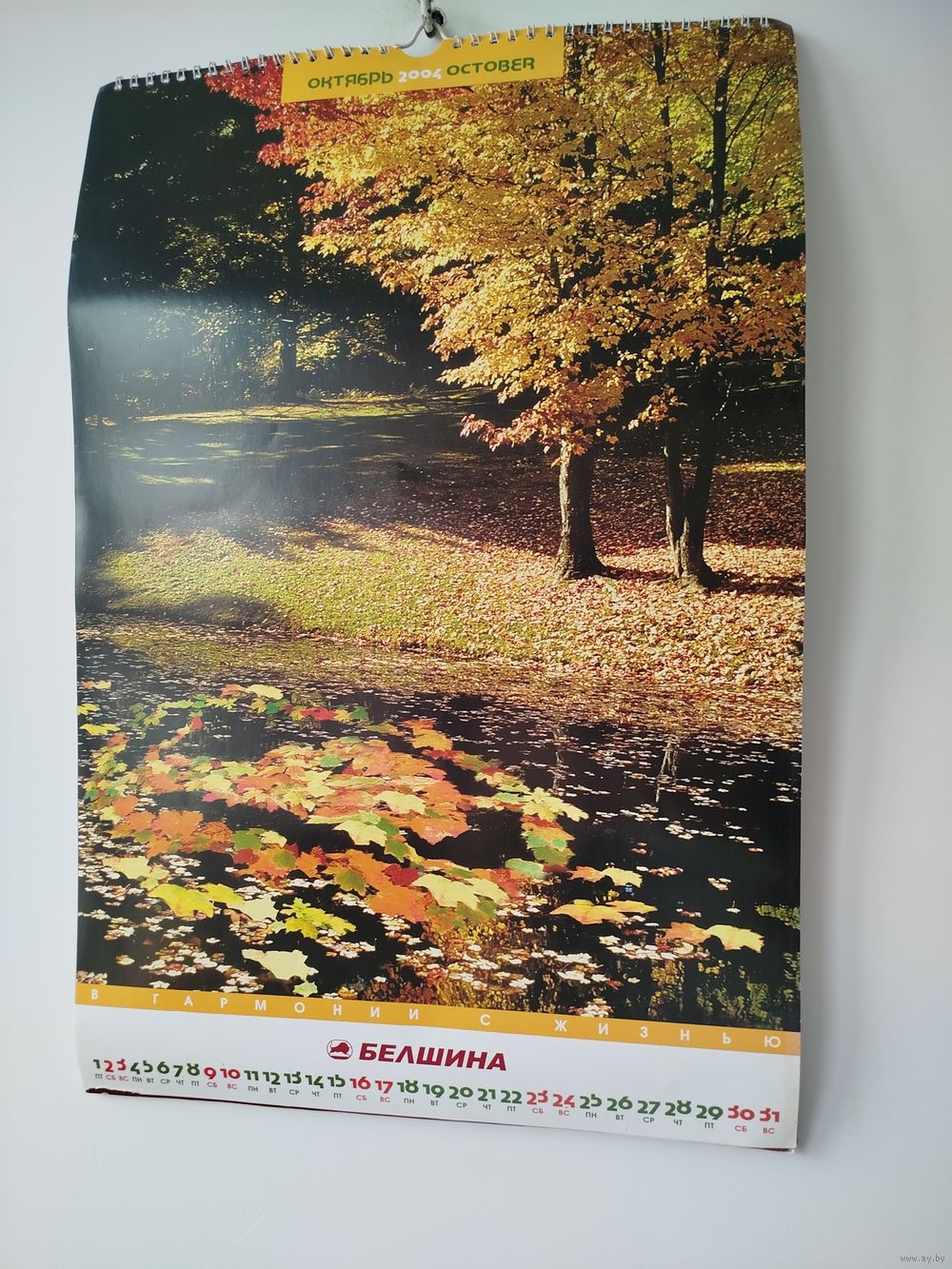 Настенный перекидной календарь ОАО "Белшина"( г.Бобруйск) на 2004 г. На каждом из 12 красочных пейзажей (по числу месяцев) можно увидеть фирменный логотип предприятия (Зубр в овале). Размер - 33х50 см.