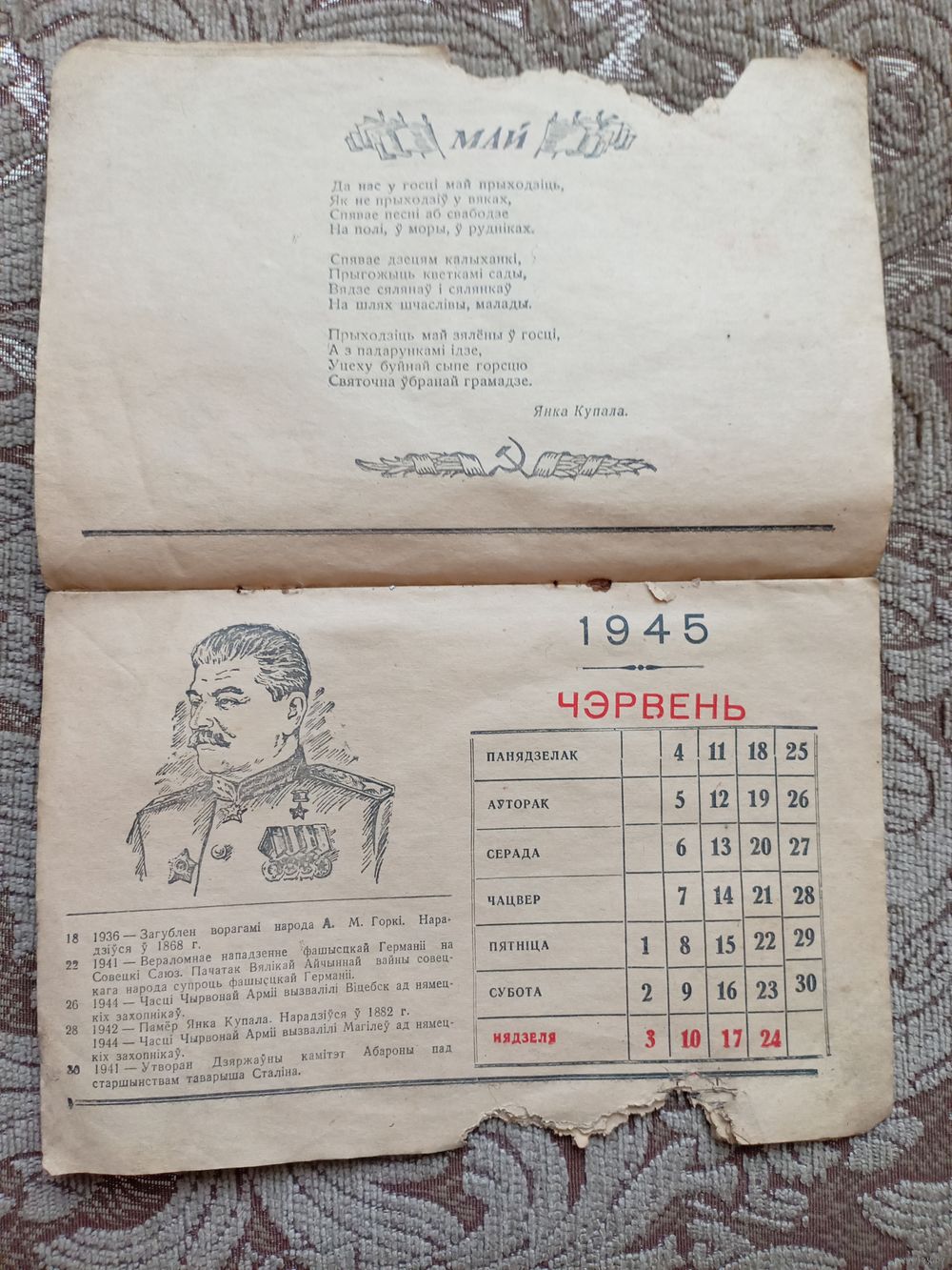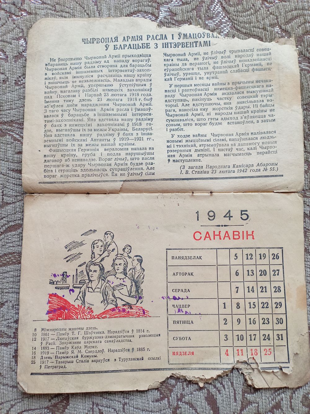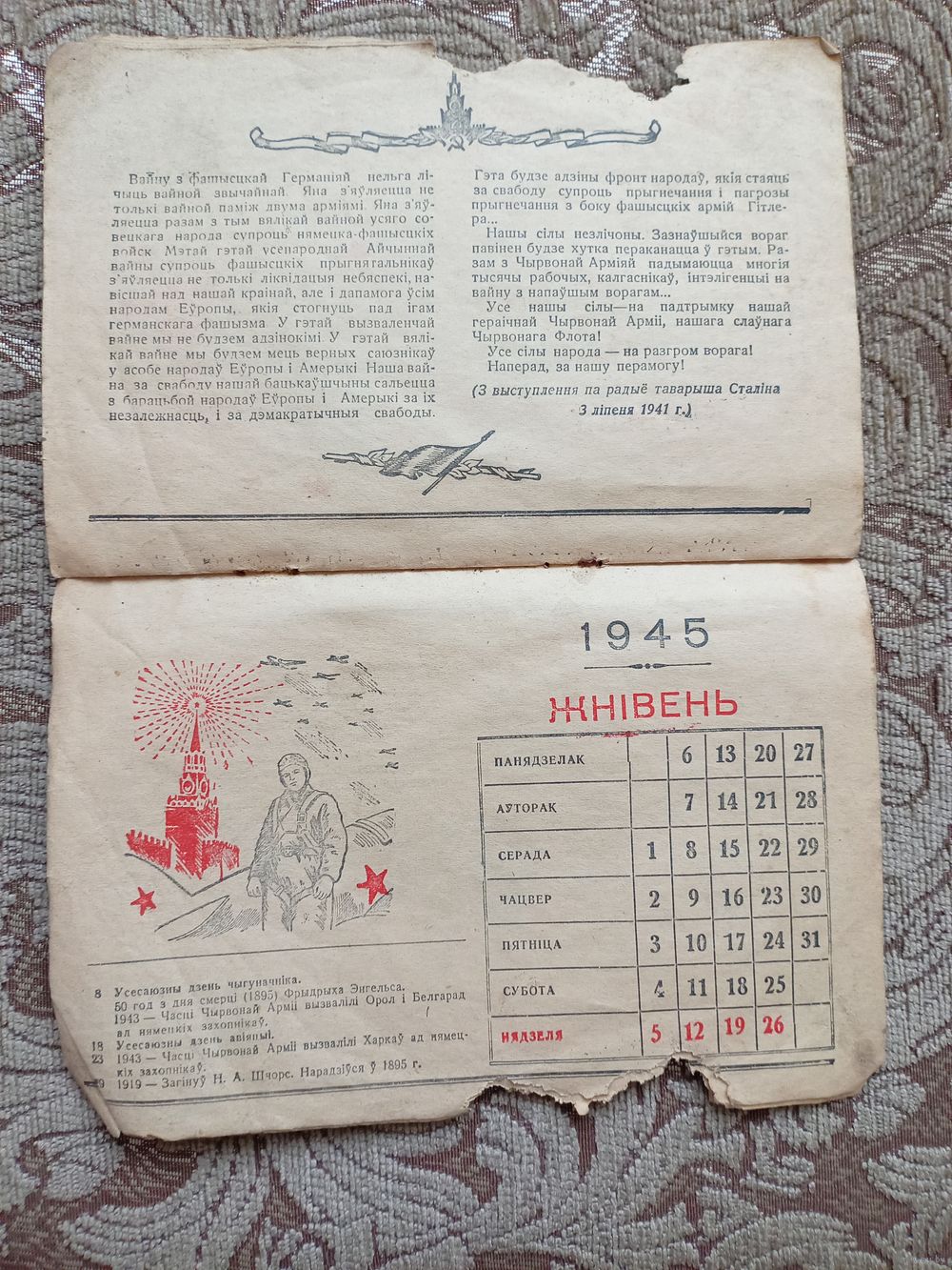 Календарь 1945 год БССР. Не хватает ноября и декабря месяца.