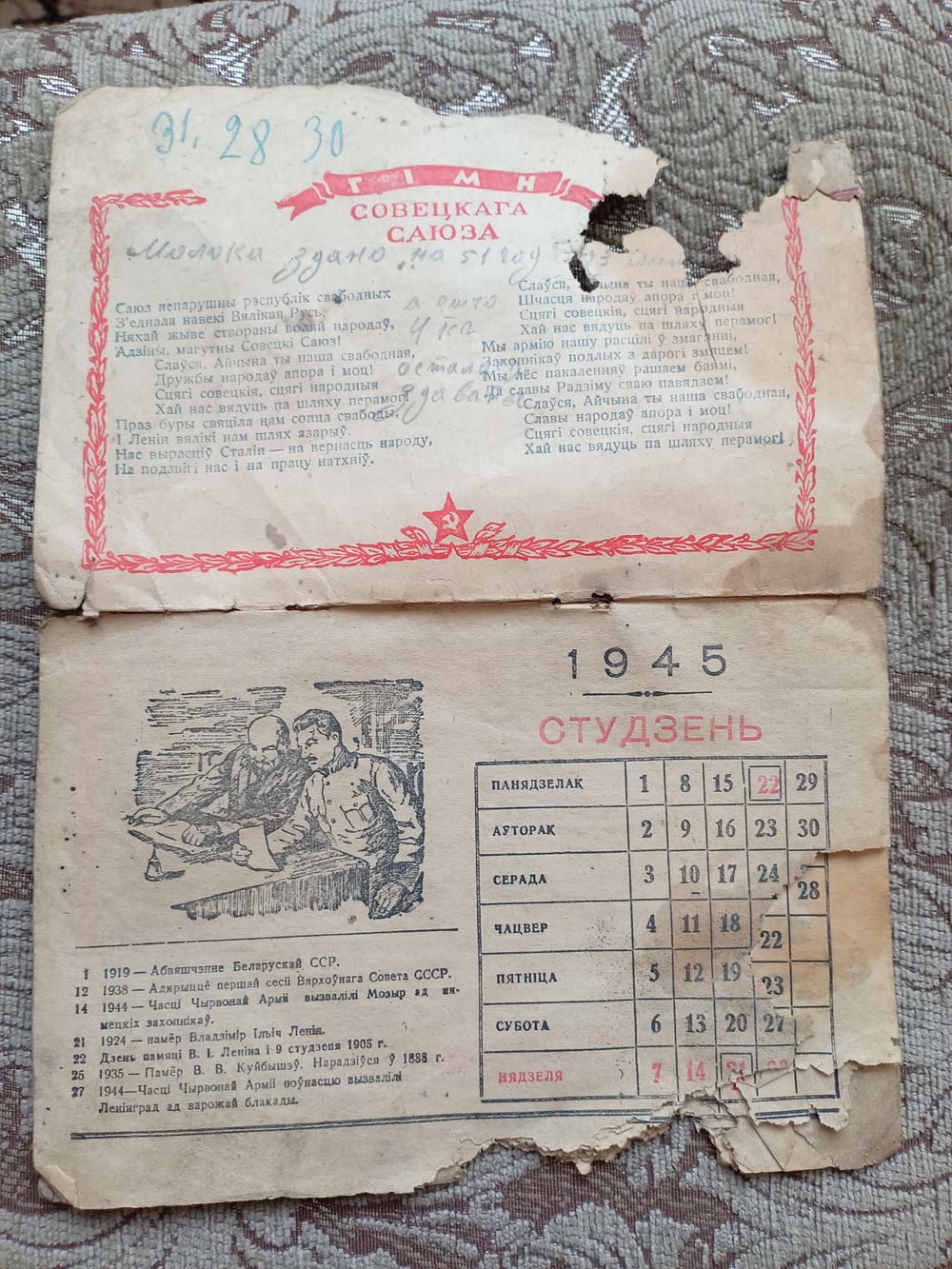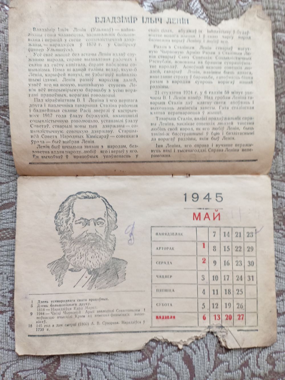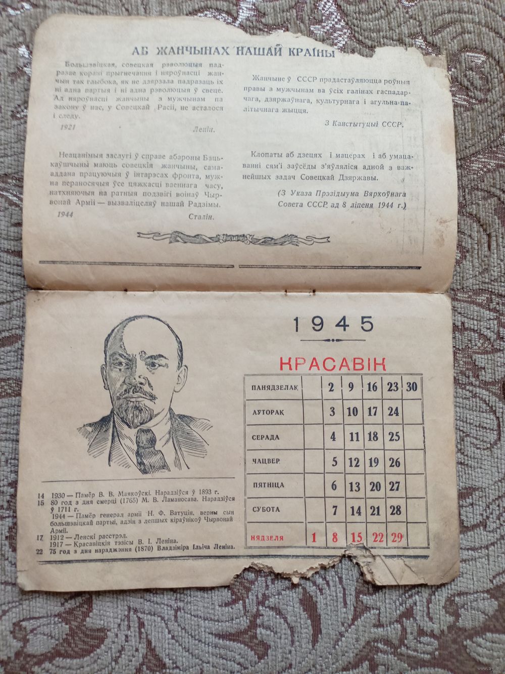 Календарь 1945 год БССР. Не хватает ноября и декабря месяца.