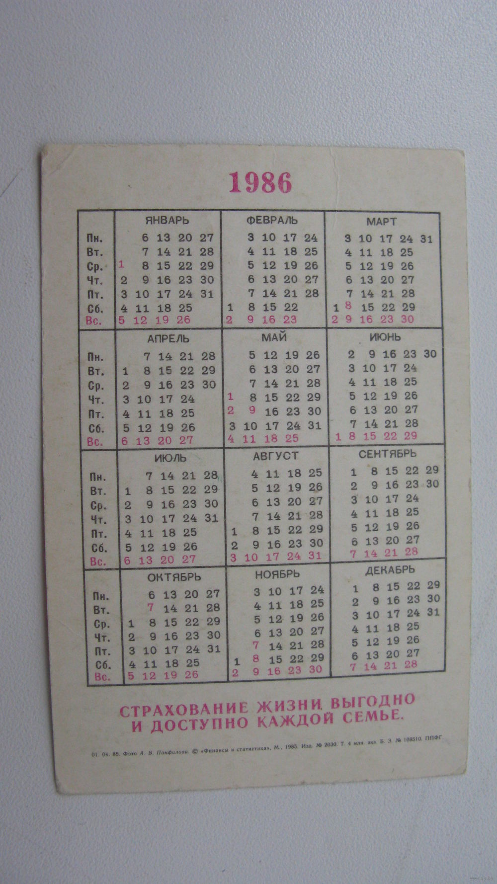 Календарь ссср 1986 Госстрах