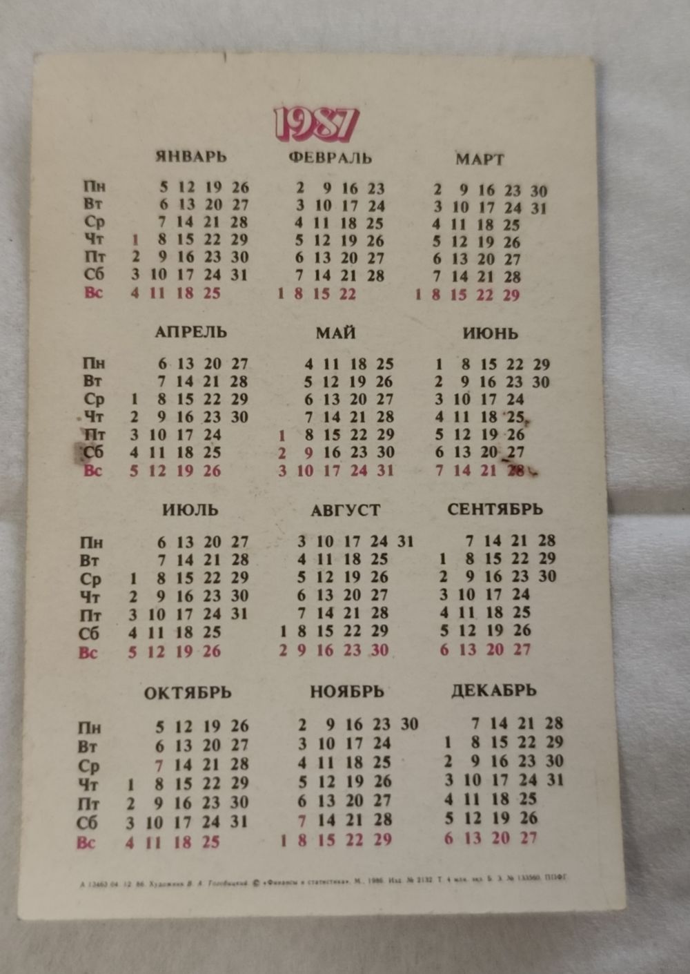 Календарь Страхование школьников 1987