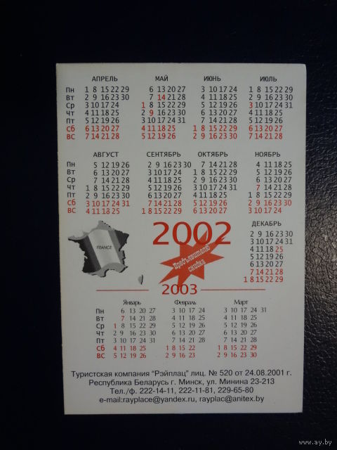 Календарик 04.2002-03.2003 г. Рэйплац Франция.