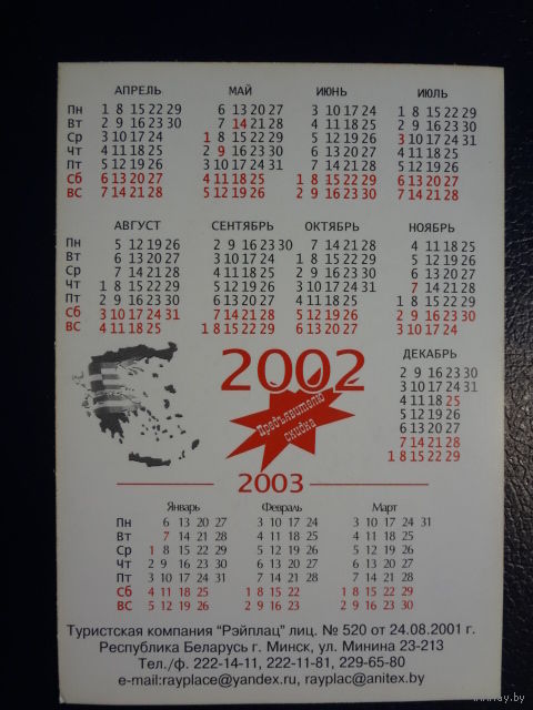 Календарик 04.2002-03.2003 г. Рэйплац Греция.