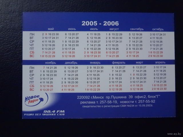 Календарик 05.2005-04.2006 г. Новое радио 98,4 FM. Радио без лишних слов.