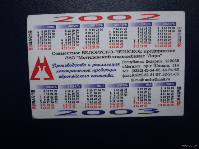 Календарик 07.2002-06.2003 г. г. Могилевский химкомбинат Заря.