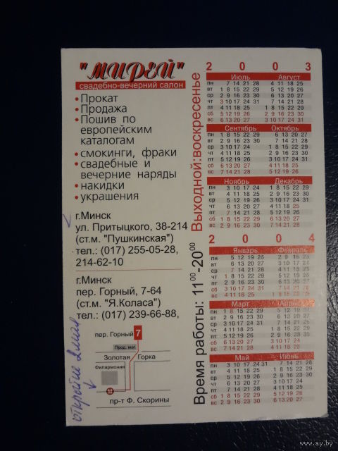 Календарик 07.2003-06.2004 г. Свадебно-вечерний салонМирей. Ответственное отношение к клиенту.