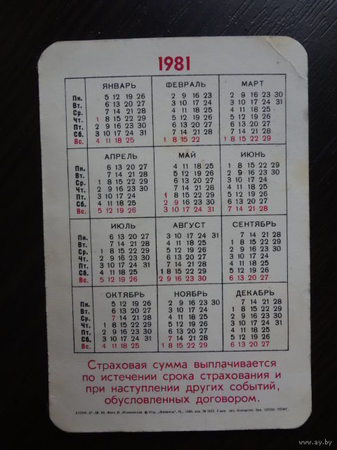 Календарик 1981 г. Госстрах. Смешанное страхование жизни.