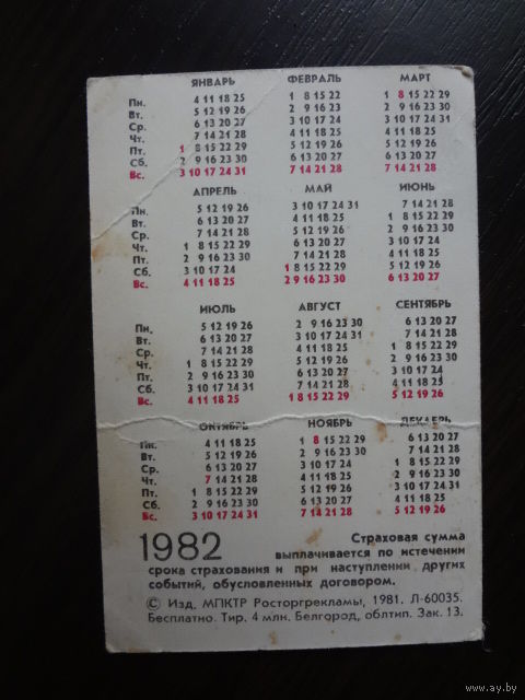 Календарик 1982 г. Госстрах. Страхование жизни.