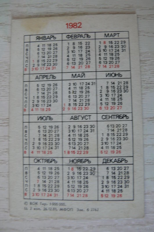 Календарик, 1982, ВОК -- Всесоюзное общество книголюбов (алые паруса).