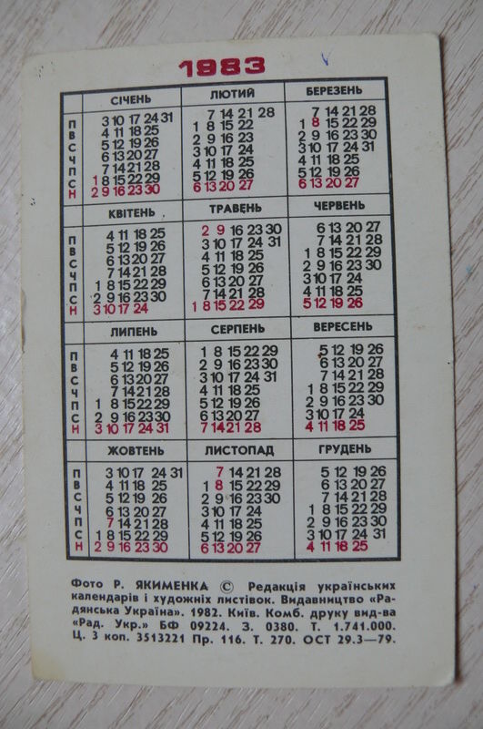 Календарик, 1983, Девушка в национальном украинском костюме, изд. Киев (каравай).