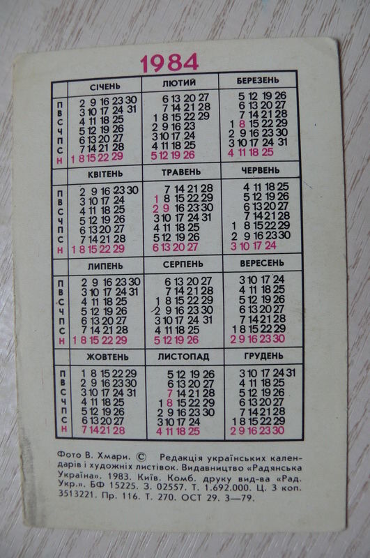 Календарик, 1984, Девушка с музыкальным инструментом (бандура), изд. Киев.