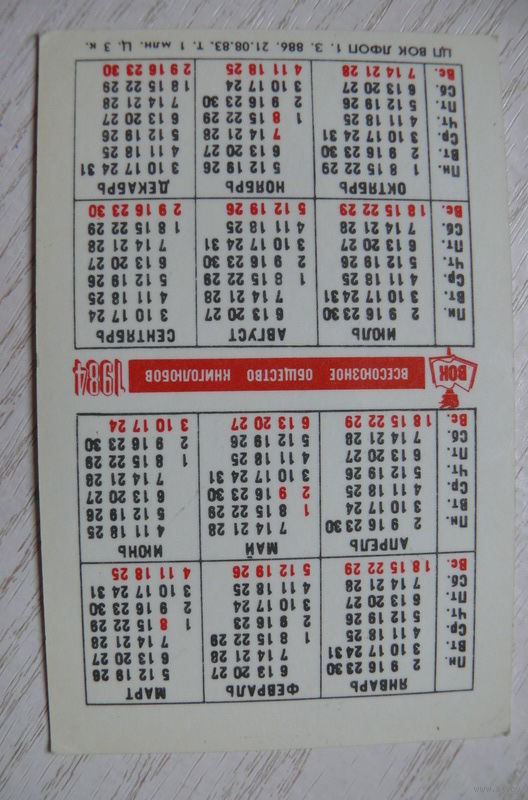 Календарик, 1984, ВОК -- Всесоюзное общество книголюбов.