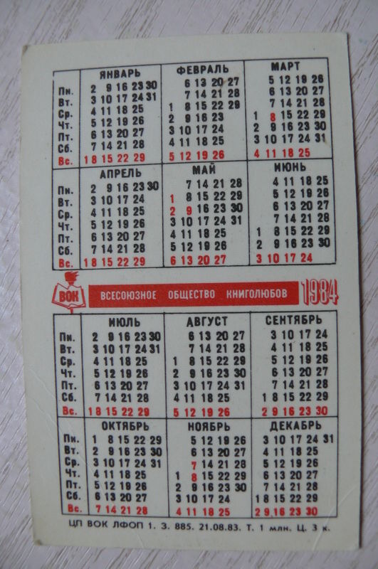 Календарик, 1984, ВОК -- Всесоюзное общество книголюбов.
