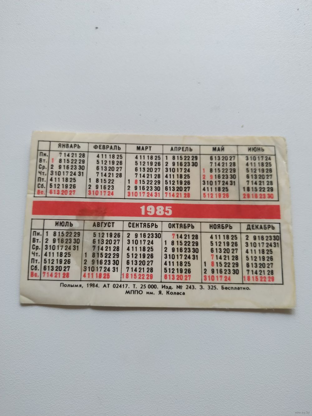 Календарик 1985 г.