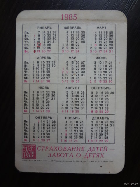 Календарик 1985 г. Госстрах. Страхование детей - забота о детях.