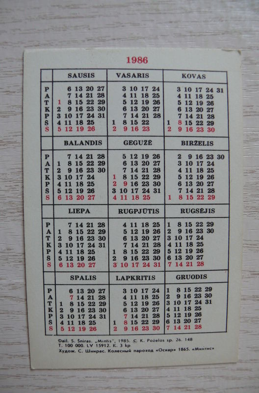 Календарик, 1986, Корабли, изд. Минтис (Литва).