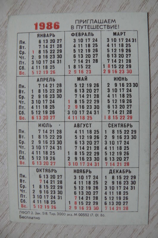 Календарик, 1986. Ленинград. Бюро реализации туристско-экскурсионных путёвок.