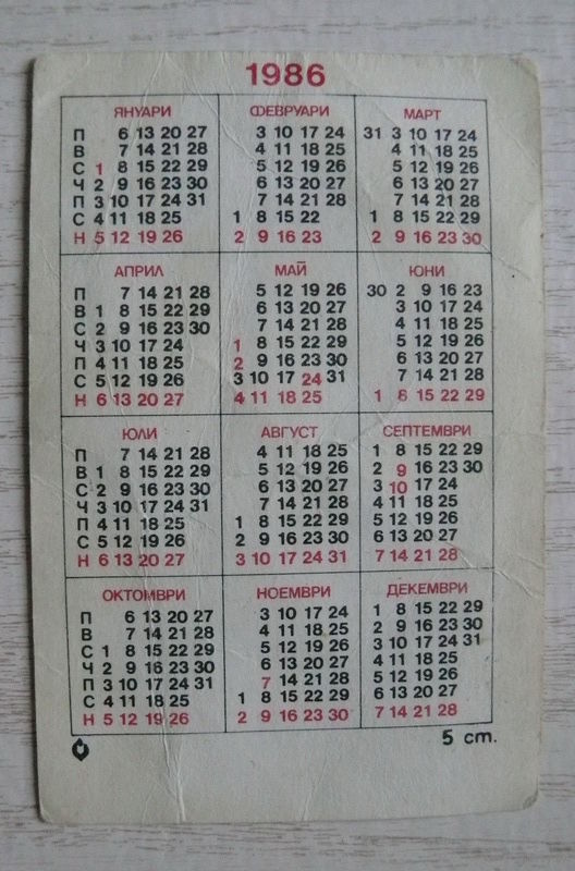 Календарик, 1986, Медведь, изд. Болгария.