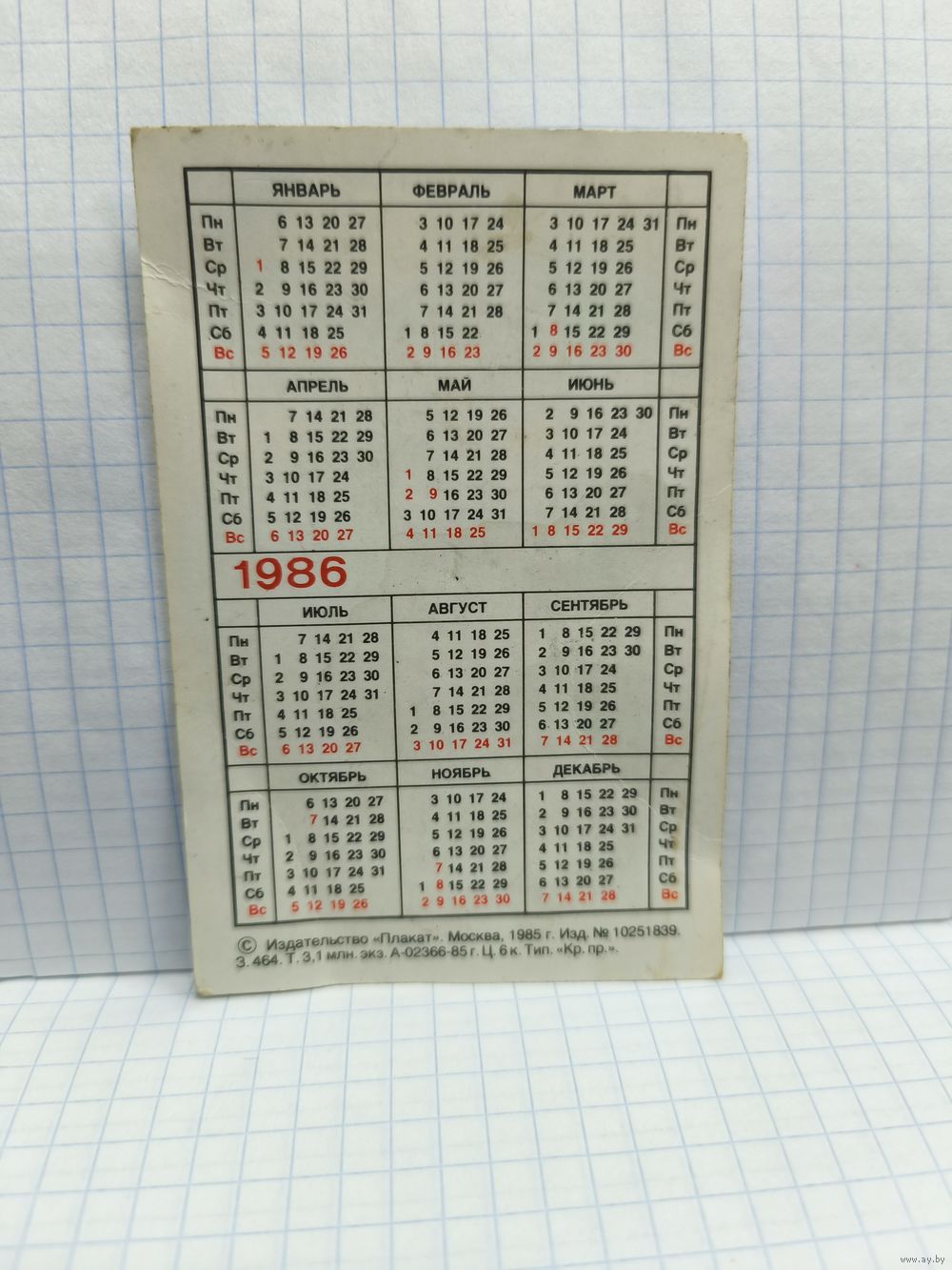 Календарик, 1986г. Ташкент. 14