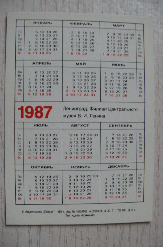 Календарик, 1987, Ленинград. Филиал Центрального музея В. И. Ленина, из серии "70. Октябрь".