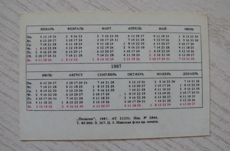 Календарик, 1987, ОСВОД; изд. Минск.