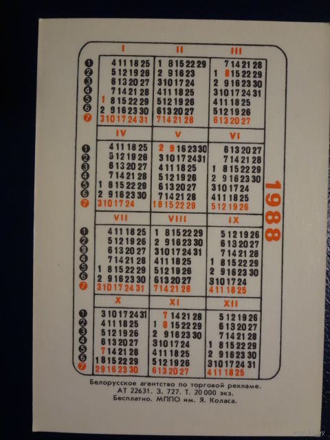 Календарик 1988 г. Фирменный обувной магазин Луч.