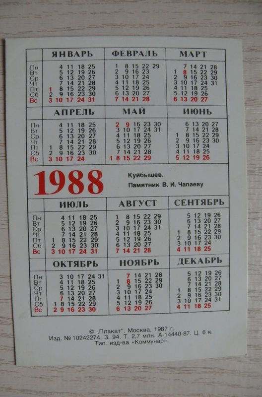 Календарик, 1988, из серии "1918-1988".