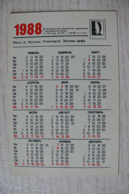 Календарик, 1988, Пятигорск. Эолова арфа.