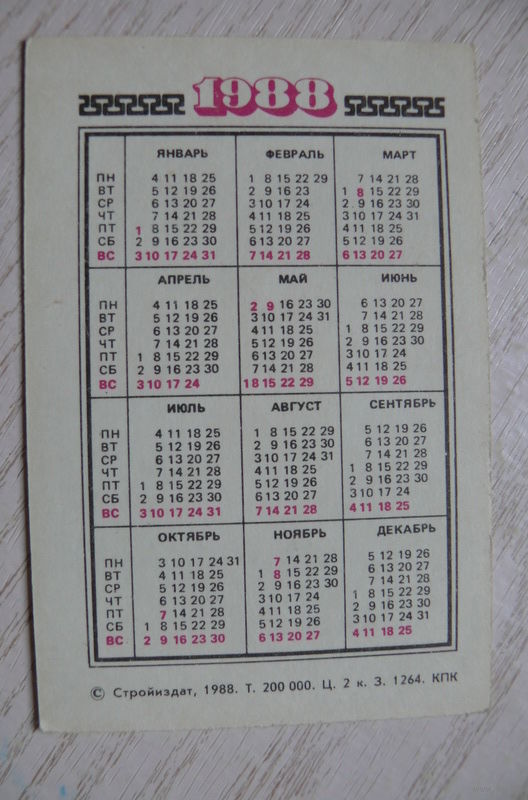 Календарик, 1988, Техника безопасности, Стройиздат.