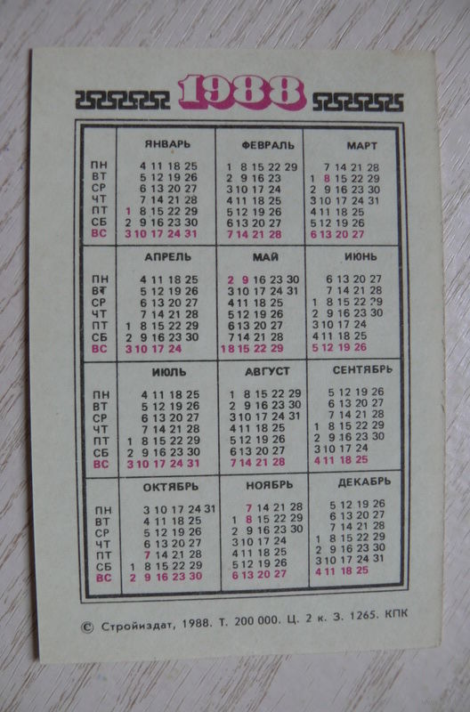 Календарик, 1988, Техника безопасности, Стройиздат.
