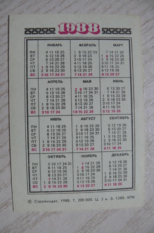 Календарик, 1988, Техника безопасности, Стройиздат.