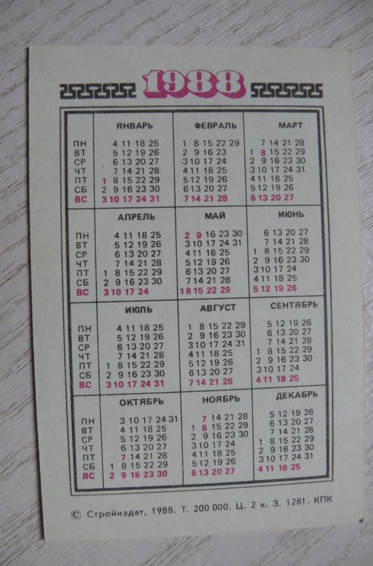 Календарик, 1988, Техника безопасности, Стройиздат (матрешка).
