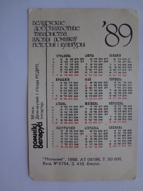 Календарик 1989 г. Дом-музей I съезда РСДРП.
