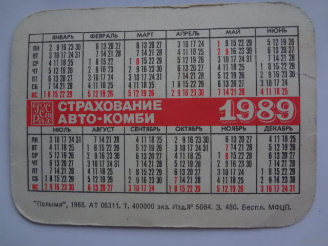 Календарик 1989 г. Страхование Авто-комби.
