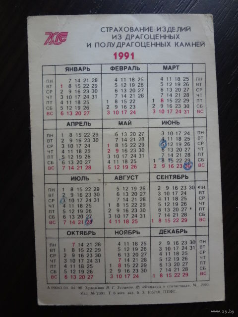 Календарик 1991 г. Госстрах. Страхование изделий из драгоценных и полудрагоценных камней.