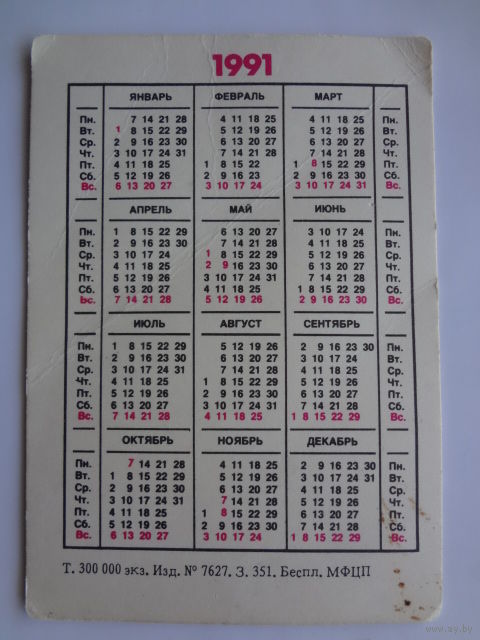 Календарик 1991 г. Госстраху 70 лет.