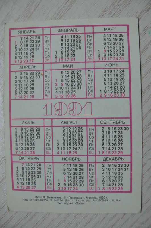 Календарик, 1991, Медведь.