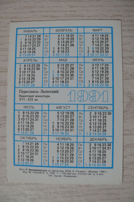 Календарик, 1991, Переславль-Залесский. Никитский монастырь, из серии "Золотое кольцо России".