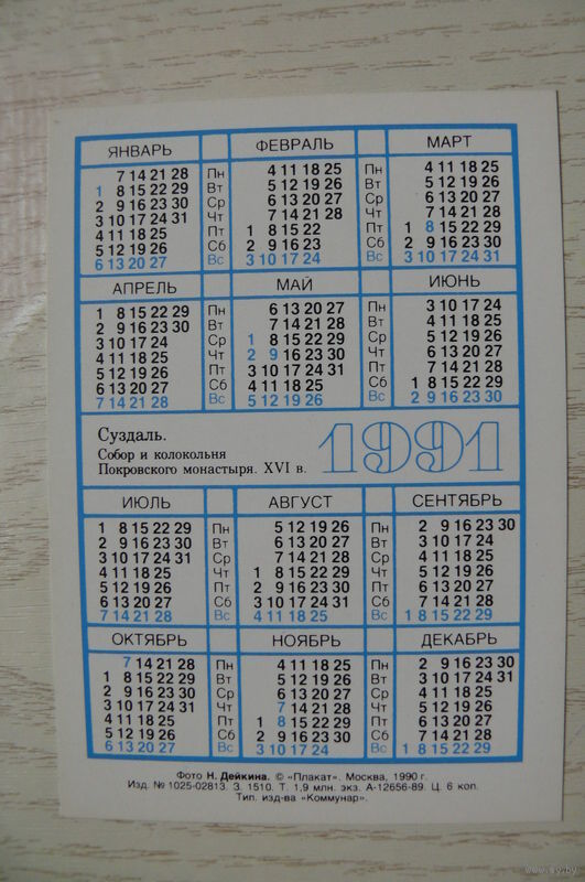 Календарик, 1991, Суздаль, из серии "Золотое кольцо России".