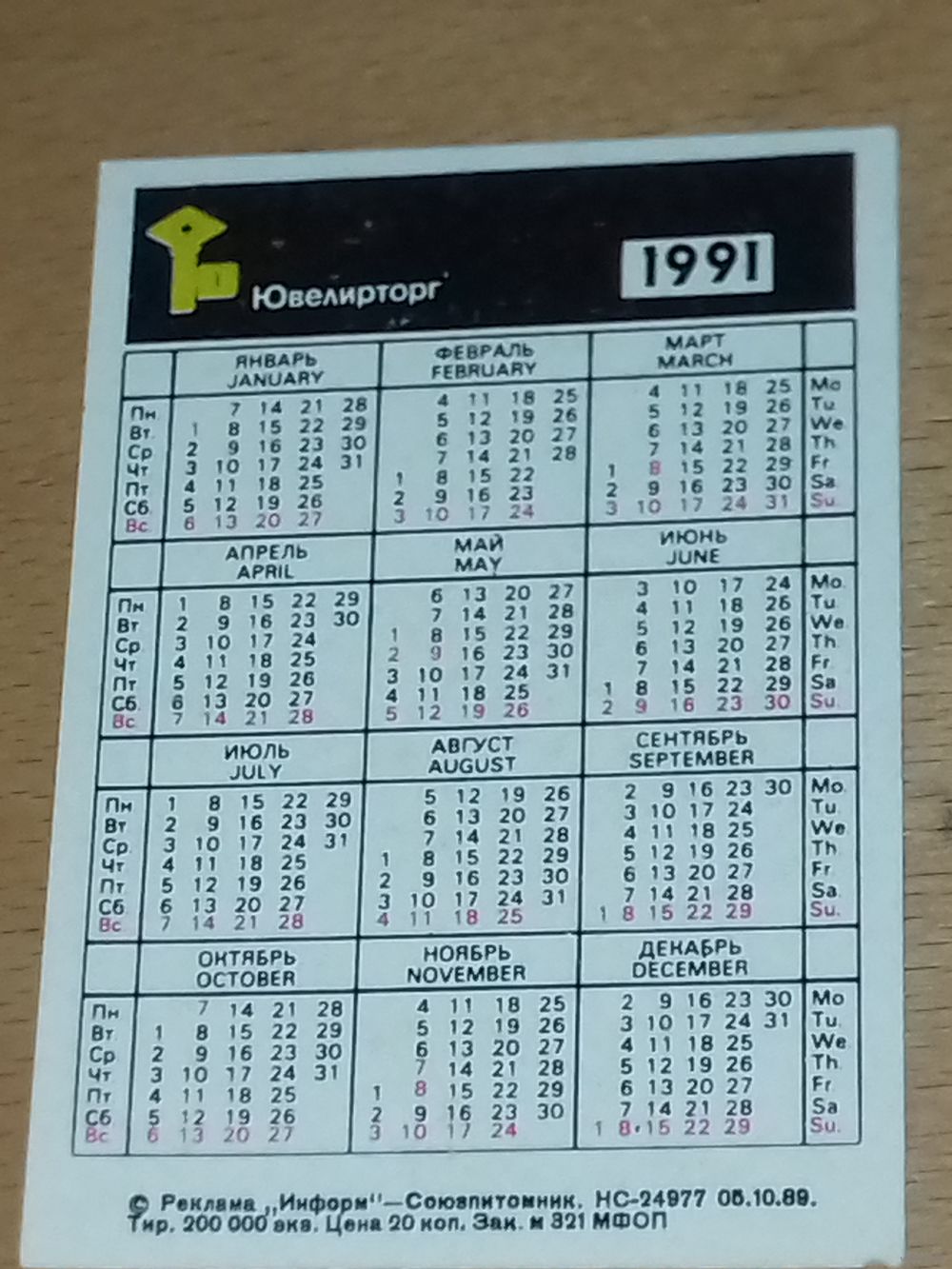 Календарик 1991 Ювелирторг. "Бижутерия - праздничность в будни"