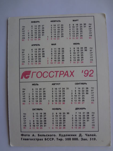 Календарик 1992 г. Госстрах.