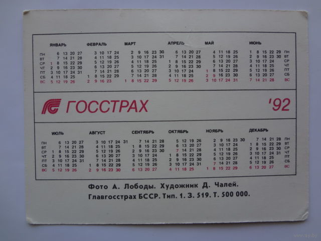 Календарик 1992 г. Госстрах.