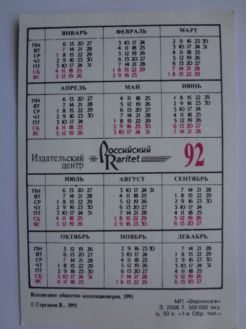 Календарик 1992 г. Медаль, посвященная 200-летию Царского Села.