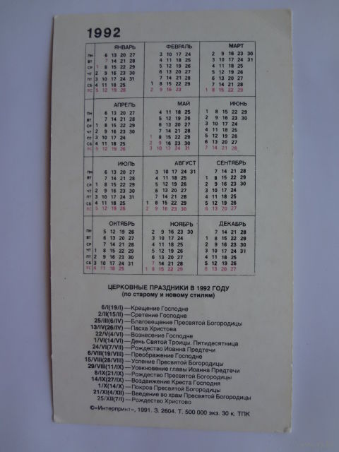 Календарик 1992 г. Неизвестный художник. Святой Николай.