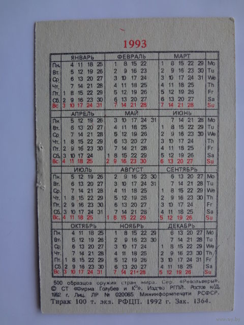 Календарик 1993 г. Револьвер. (5).