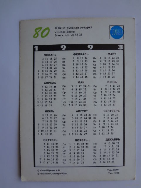 Календарик 1993 г. Южно-русская овчарка. (80).