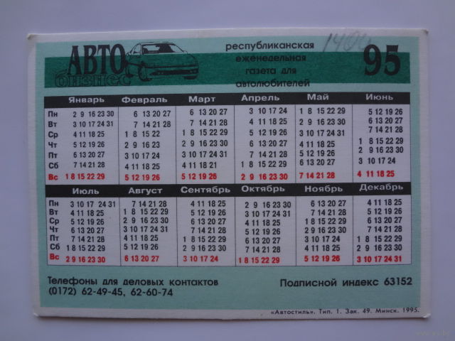 Календарик 1995 г. Автобизнес. Республиканская еженедельная газета для автолюбителей.