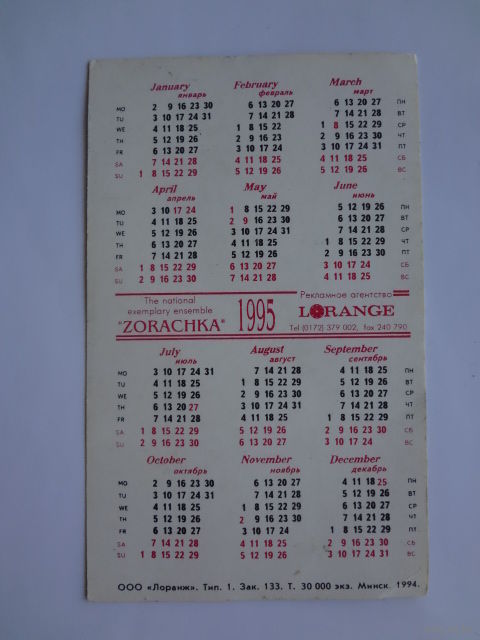 Календарик 1995 г. Национальный образцовый ансамбль Зорачка.