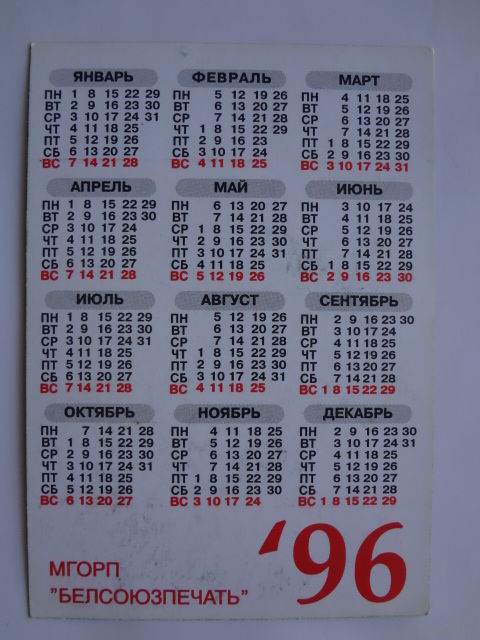 Календарик 1996 г. Белсоюзпечать.