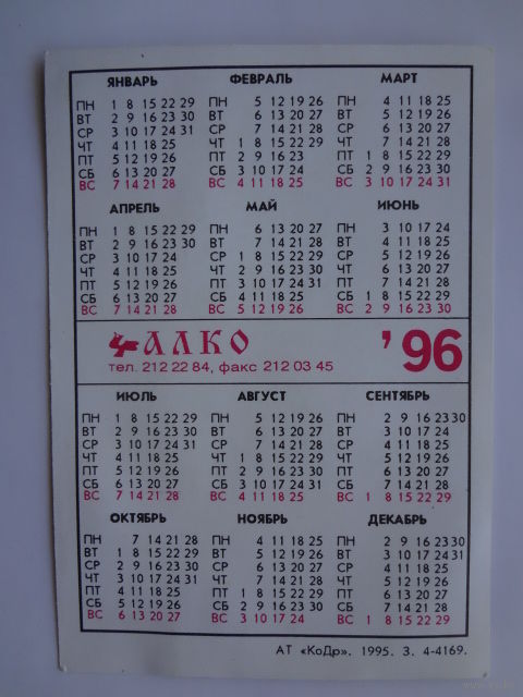 Календарик 1996 г. Сбарро-Галлваг (Швейцария).